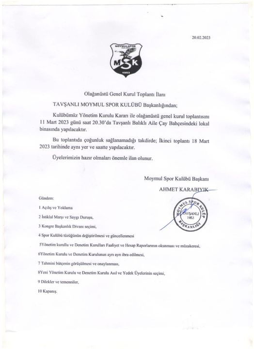 Moymulspor olağan üstü kongresini 18.03.2023 Cumartesi günü gerçekleştirecek.